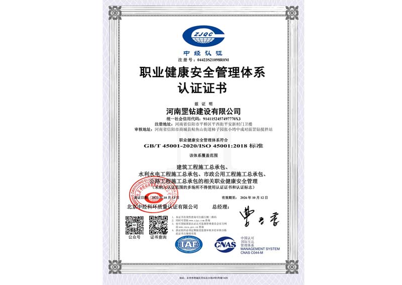 關鍵詞:河南罡鉆職業健康安全管理體系認證證書
